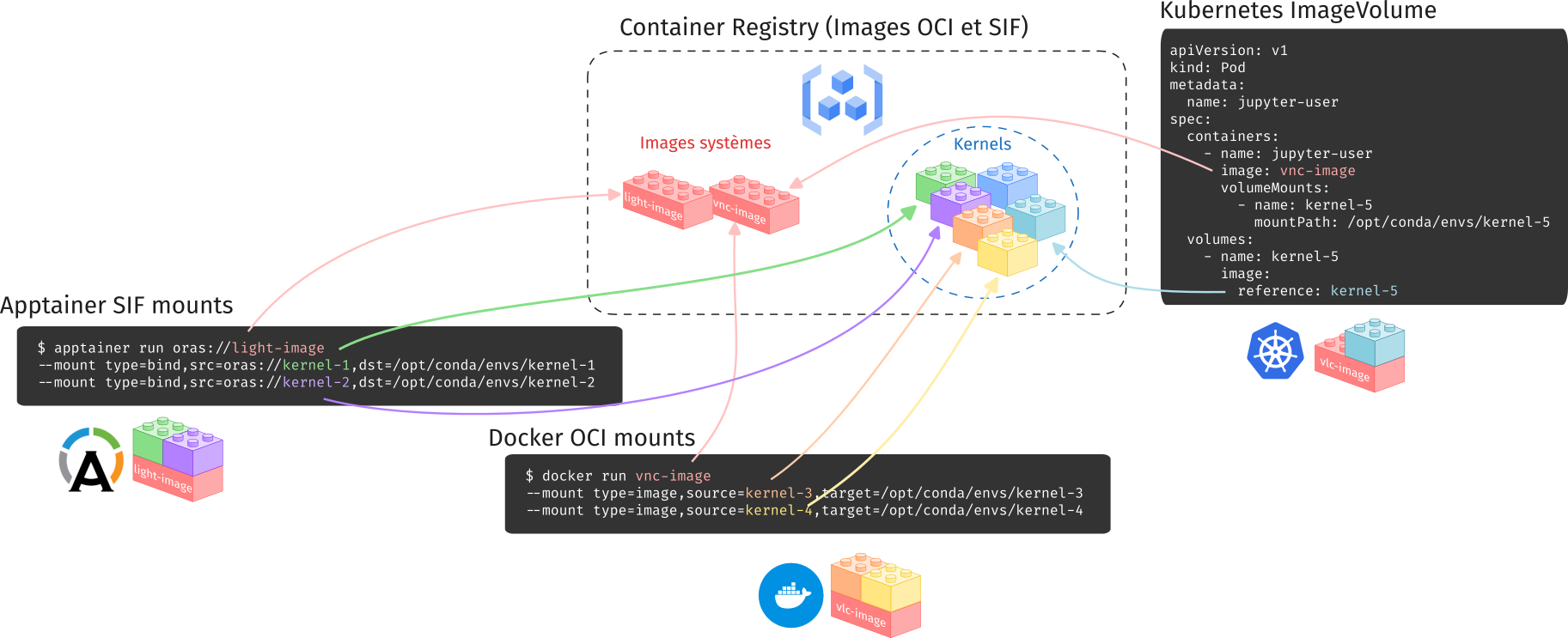 Les kernels sont exposés aux images système via des mécanismes de montage et découverts grace à l’extension Jupyter nb_conda_kernels.